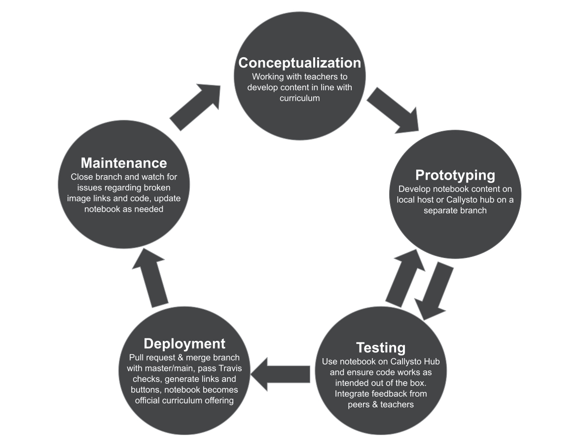 In most software development you will see some sort of development cycle. Our notebooks are no different, however it is important that we develop notebooks with the needs of educators and the K-12 curriculum in mind. For this reason, it is important to include their ideas and feedback at the early stages of content creation to ensure that our notebooks are relevant and useful.